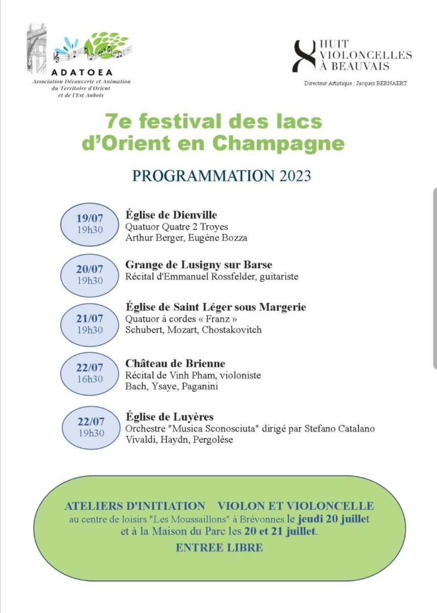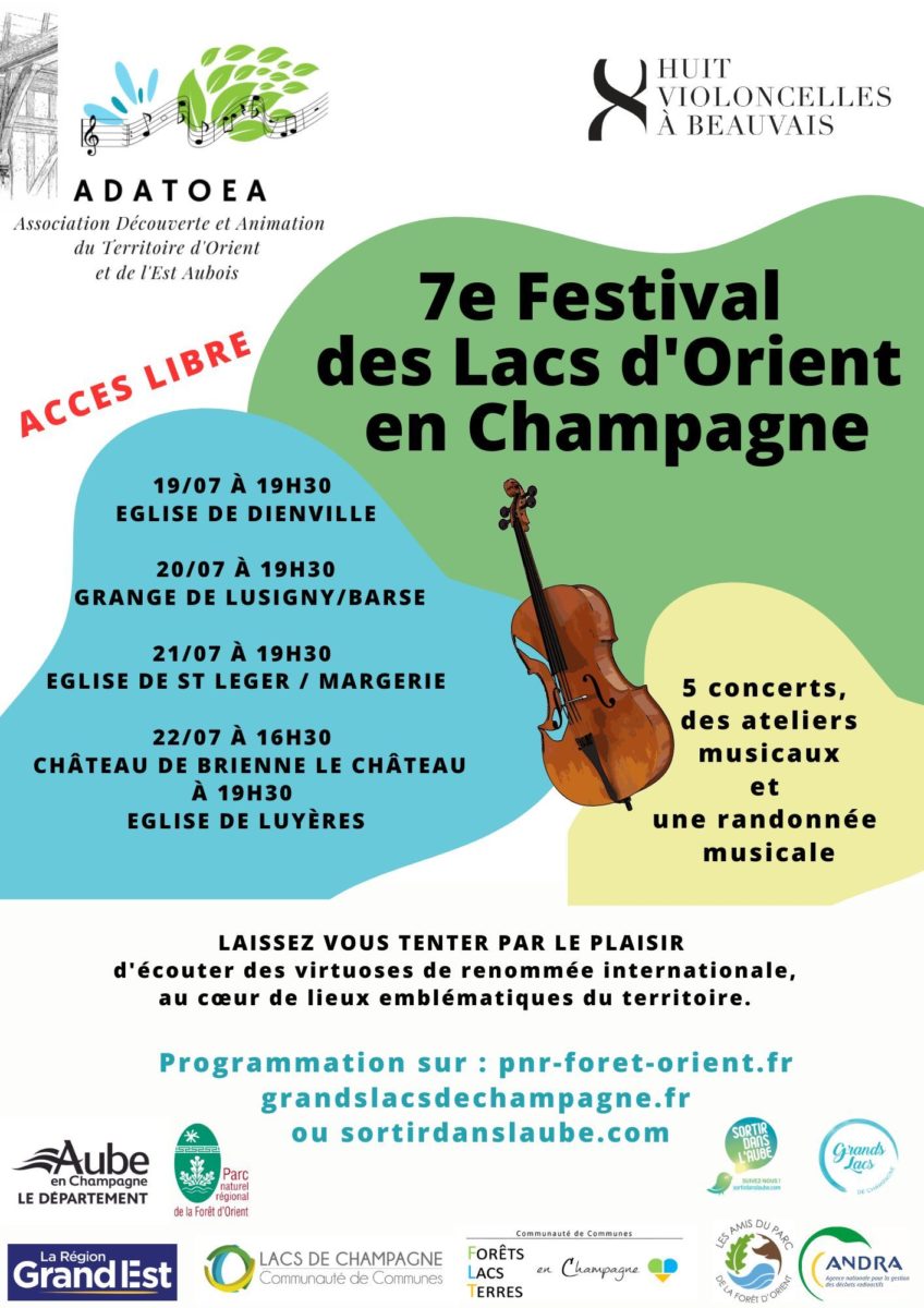 Le Festival des lacs d’Orient en Champagne est l’occasion de coupler musique classique et patrimoine traditionnel, pour vous offrir une expérience unique ! Organisé par l’ADATOEA (Association Découverte et Animation du Territoire d’Orient et de l’Est Aubois) et l’association Huit Violoncelles à Beauvais, il vous propose une série de rendez-vous sur différents sites du territoire.