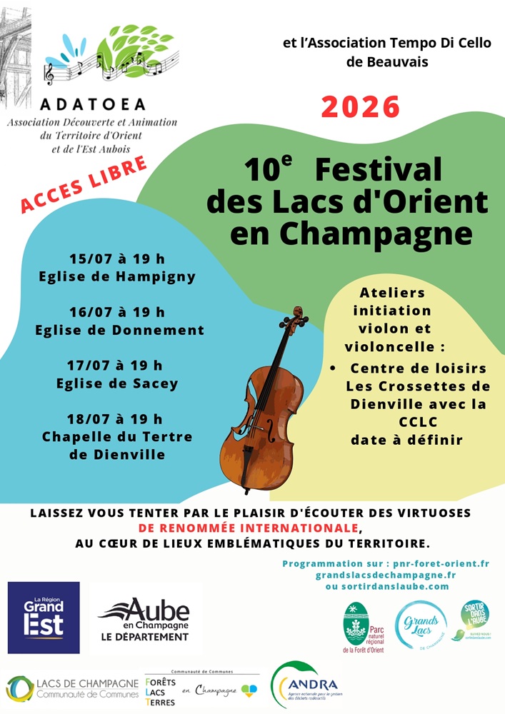 L'association ADATOEA en association avec Tempo Di Cella de Beauvais vous donnent rendez-vous pour la 10ème édition du Festival des Lacs d'Orient en Champagne ! Un événement à ne pas manquer pour les passionnés de musique classique. Venez découvrir des artistes d'exception au sein de joyaux du patrimoine remarquables et initiez-vous à la musique classique grâce aux ateliers proposés.