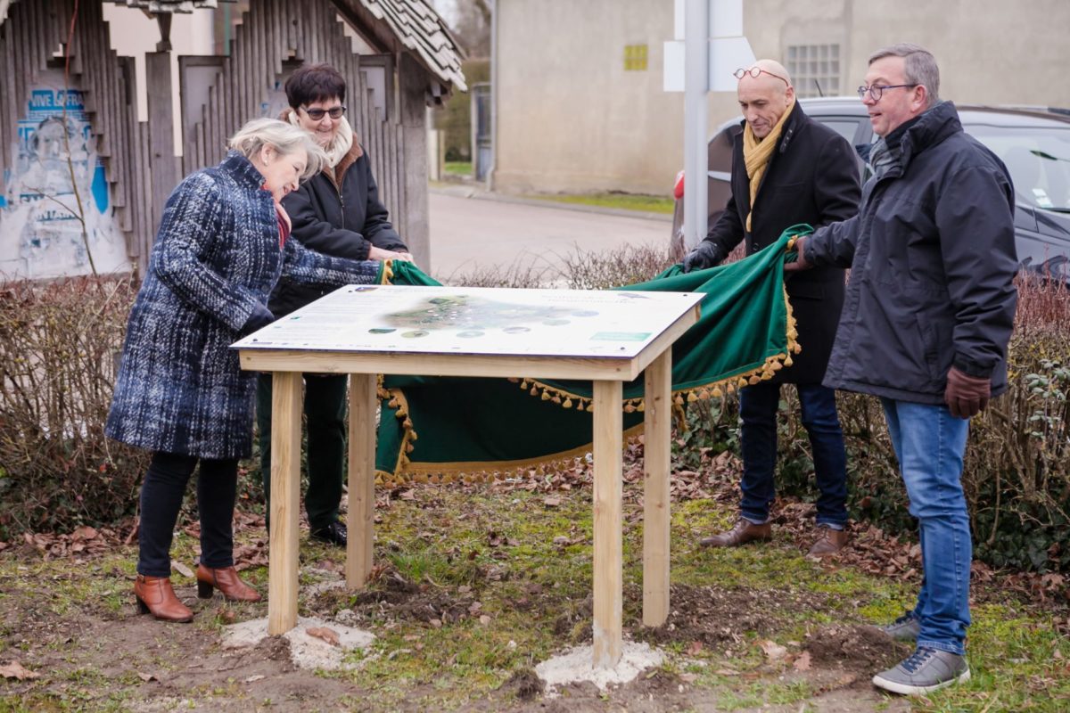 Inauguration du panneau de départ du sentier le 5 février 2024 par Annie Duchêne (Conseillère Régionale, Présidente du Comité consultatif de gestion), Claude Homehr (Conseillère départementale, Présidente de la Commission Environnement du PnrFO), Jésus Cervantes (Président du PnrFO) et Fabien Gérard (Maire de Courteranges).