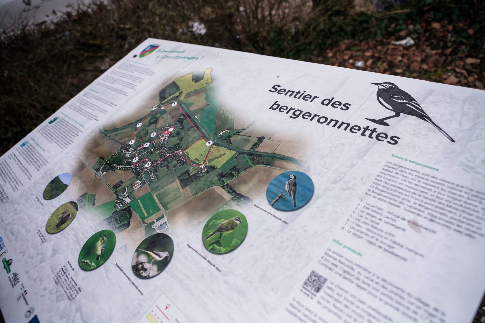 Cinq espèces de Bergeronnettes ont déjà été observées sur la commune, avec notamment un couple de Bergeronnettes citrine qui sont particulièrement rares en Champagne… le nom du sentier leur rend donc honneur ! Au fil des panneaux, les Bergeronnettes vous invitent à jouer avec elles en répondant à des questions dont vous obtiendrez les réponses grâce au QR code inscrit en dessous. Randonnée familiale formant une boucle de 4 km (2,7 km en suivant le raccourci), le circuit comporte un panneau principal au départ, suivi de 8 panneaux pédagogiques sur son tracé, lui-même matérialisé par une quinzaine de flèches de balisage.