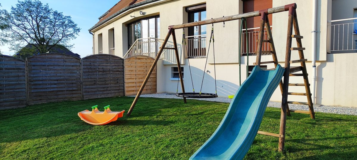 - à l'extérieur : cours clôturée et privée avec 3 places de stationnement et un grand jardin.