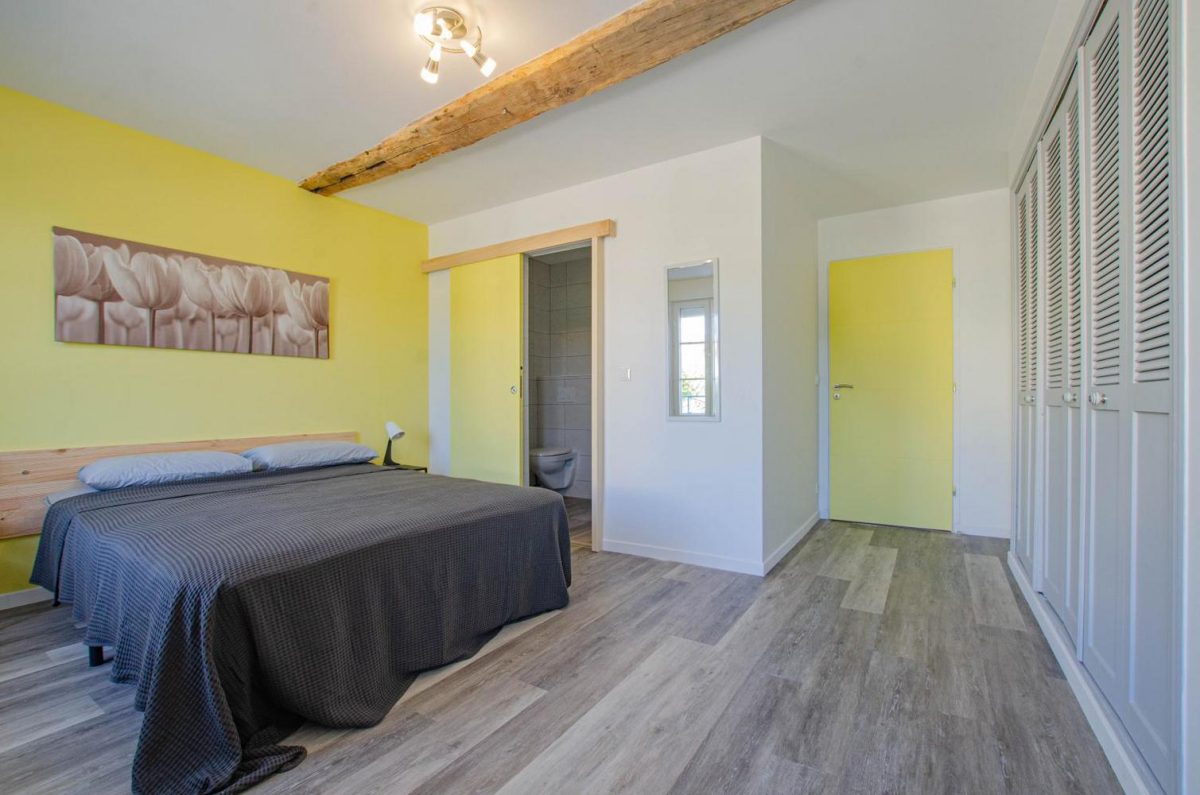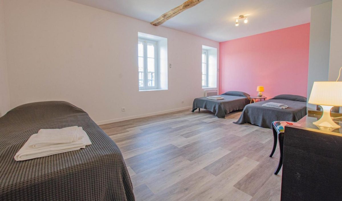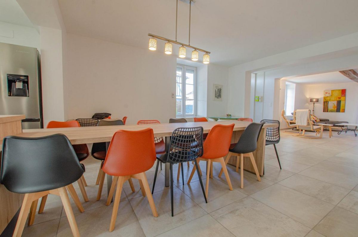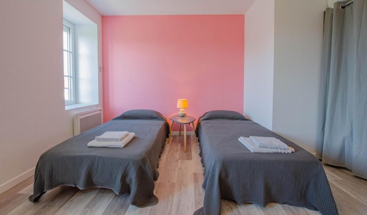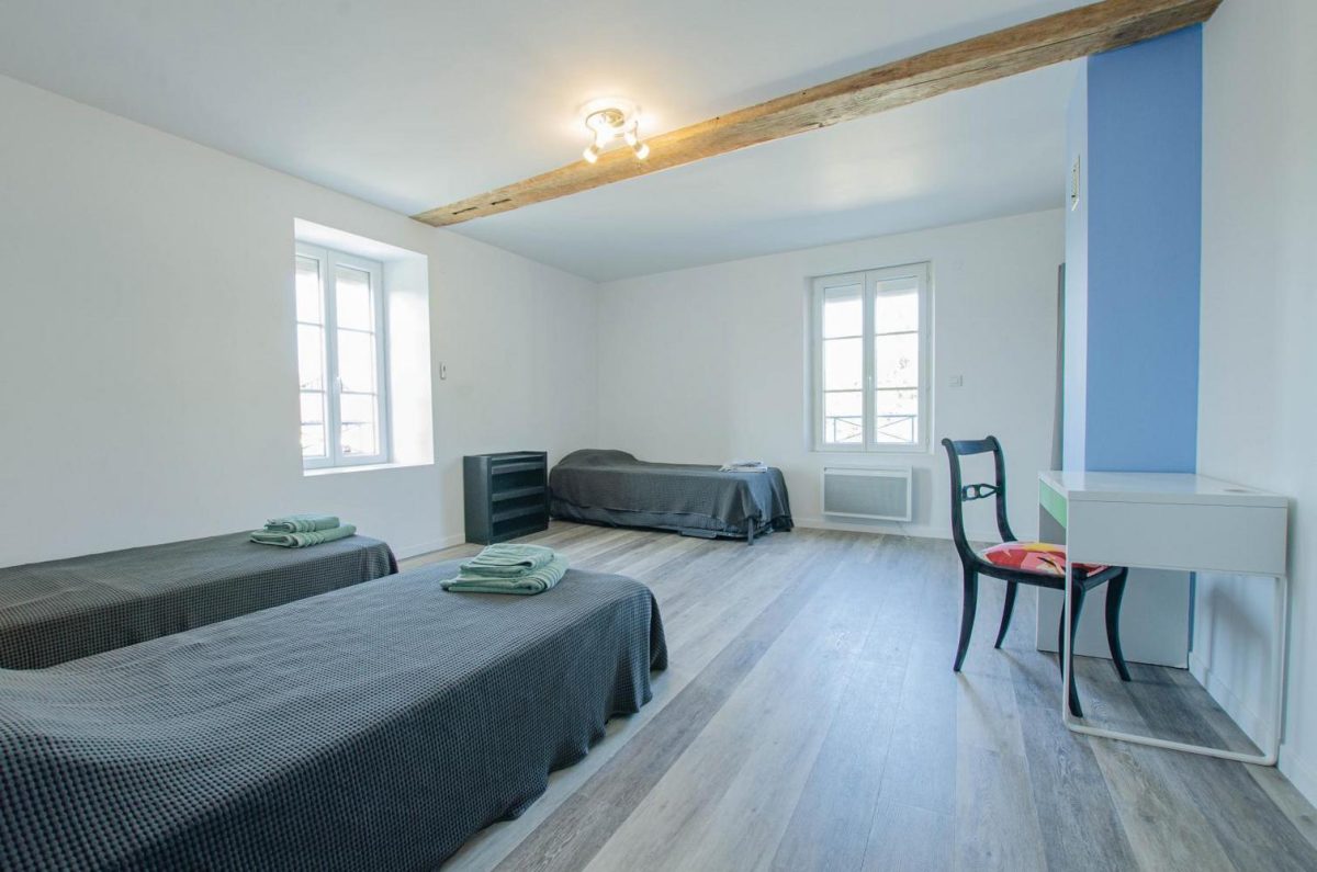 A l'étage : un salon lecture, 2 chambres doubles (lit 160x200) avec ses sanitaires privatifs (douche, vasque, WC), 2 chambres dortoir (4 lits de 90x200), une salle de bain avec cabine de douche, double vasque et baignoire, WC séparé.
