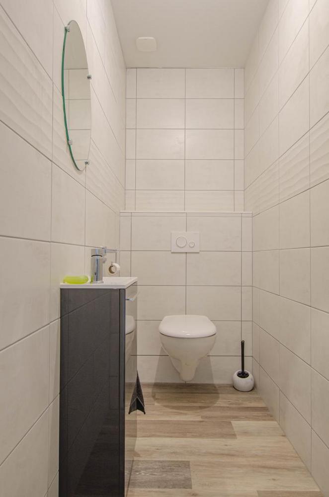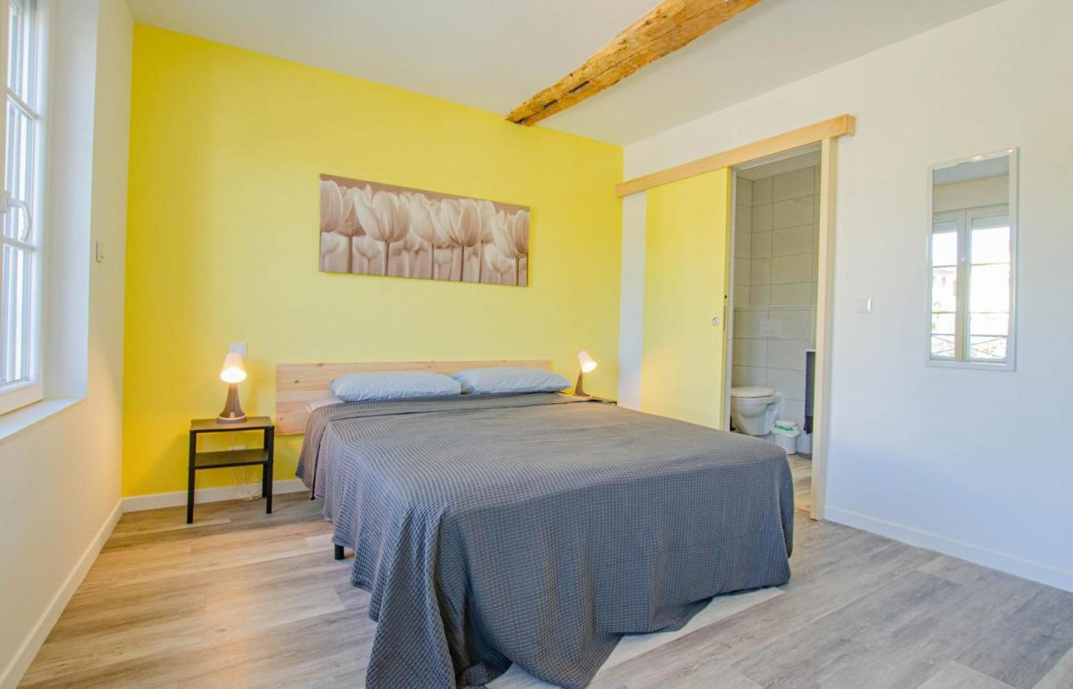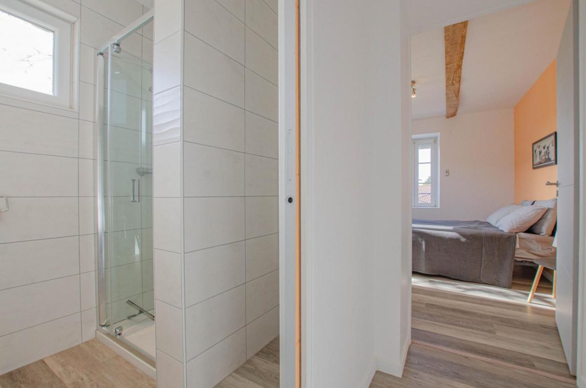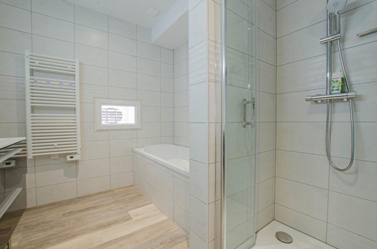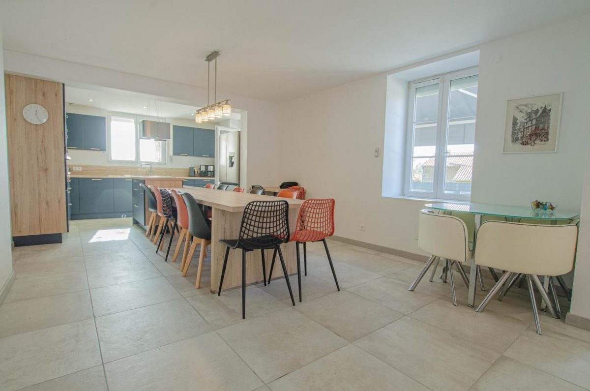 A l'étage : un salon lecture, 2 chambres doubles (lit 160x200) avec ses sanitaires privatifs (douche, vasque, WC), 2 chambres dortoir (4 lits de 90x200), une salle de bain avec cabine de douche, double vasque et baignoire, WC séparé.