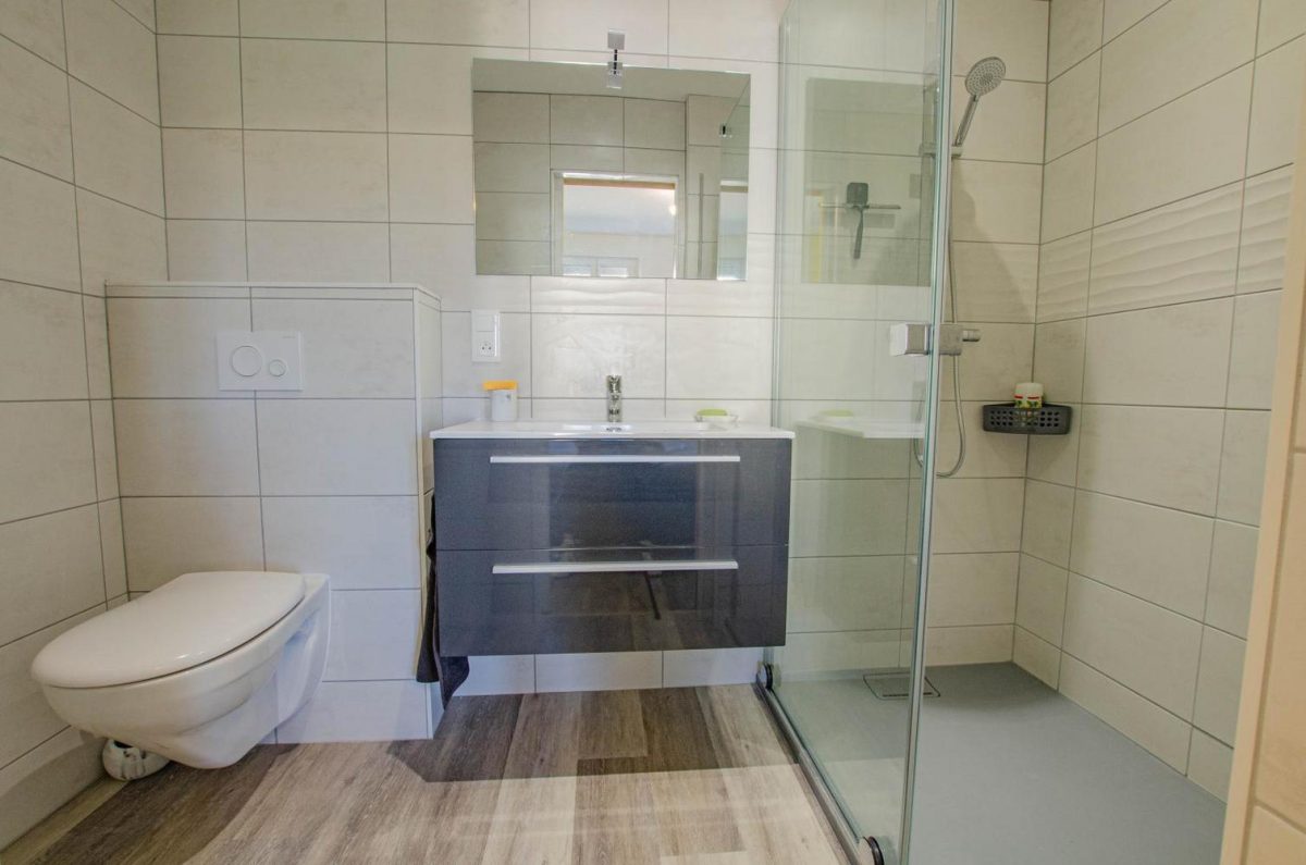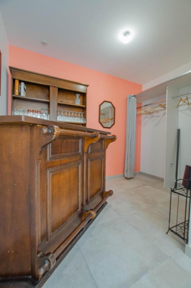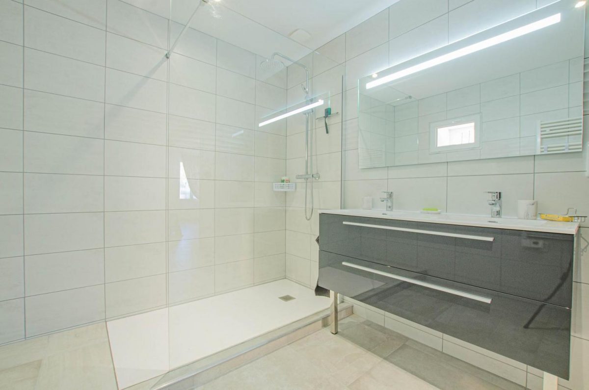 Au rez-de-chaussée: séjour composé d'une cuisine équipée avec espace repas, coin salon avec cheminée, bar et vestiaire, une buanderie (réfrigérateur supplémentaire), une salle d'eau avec WC et une chambre parentale (lit 180x200) avec sanitaires privatifs (double vasque, douche, WC).