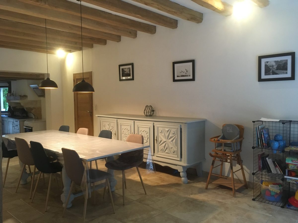 Au rez-de-chaussée, vous trouverez une cuisine équipée, un salon-salle à manger (60m2), une salle de bain, un wc, une chambre familiale (2 chambres communicantes), la terrasse et le verger de 700m.