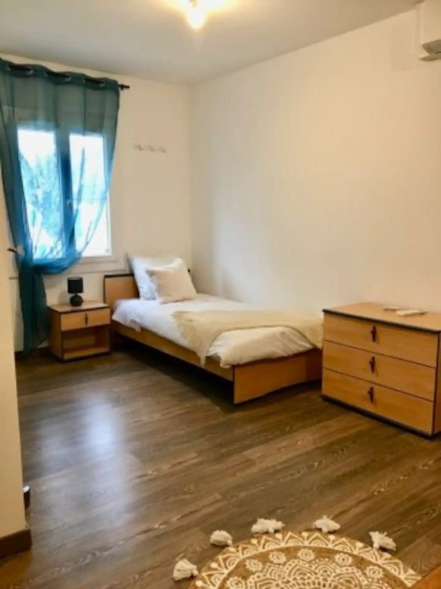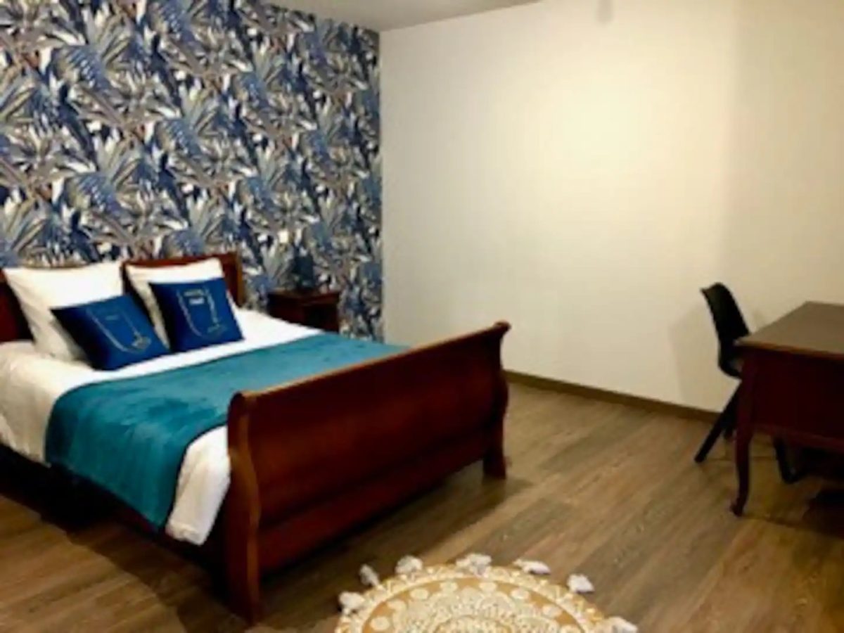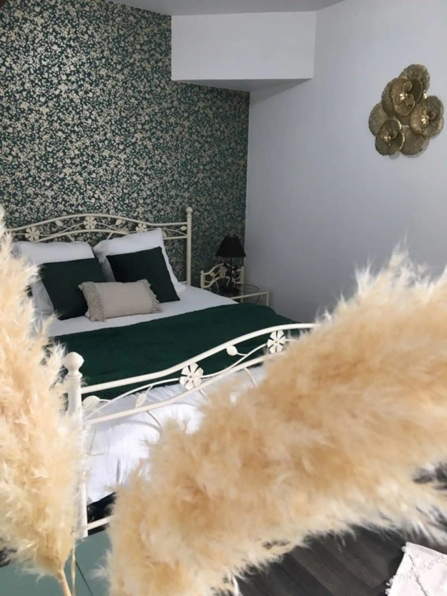 à l'étage, une chambre émeraude avec un lit double 160, une deuxième chambre bleue avec un lit double 140, un lit simple de 90 et un lit parapluie.