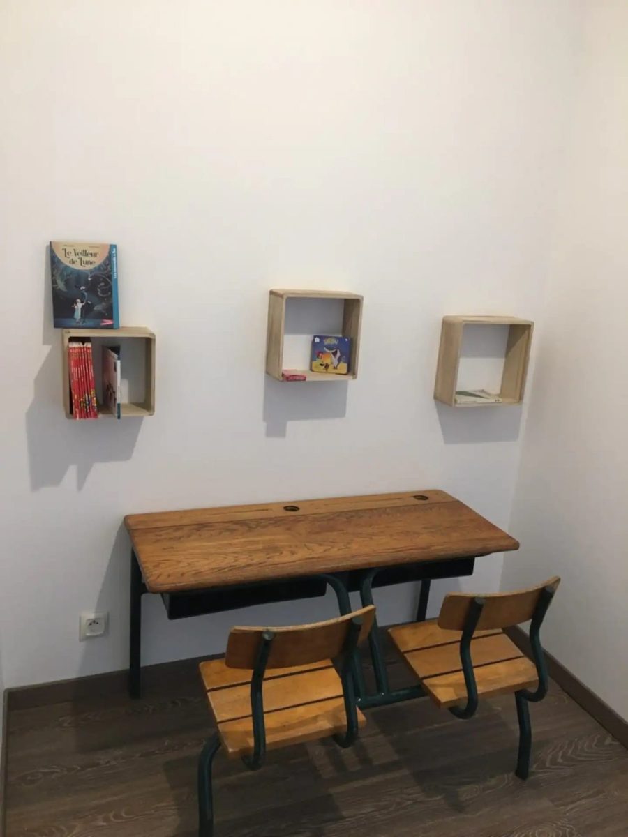 Sur le palier, un bureau enfant et une salle de bain avec douche.