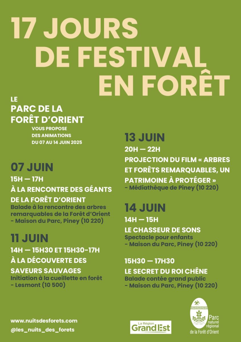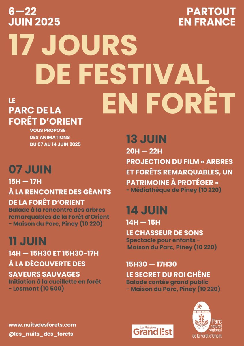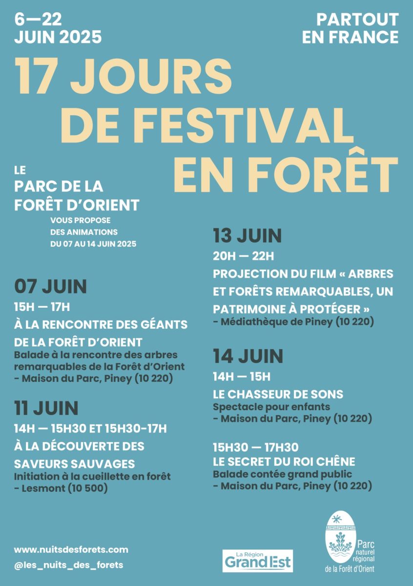 Pour 2025, le Parc naturel régional de la Forêt d’Orient renouvelle sa participation à ce festival, porté par l’association Nuits des Forêts ! Découvrez la Forêt d’Orient sous un nouveau jour avec une série d’événements organisés sur le territoire durant le mois de juin :