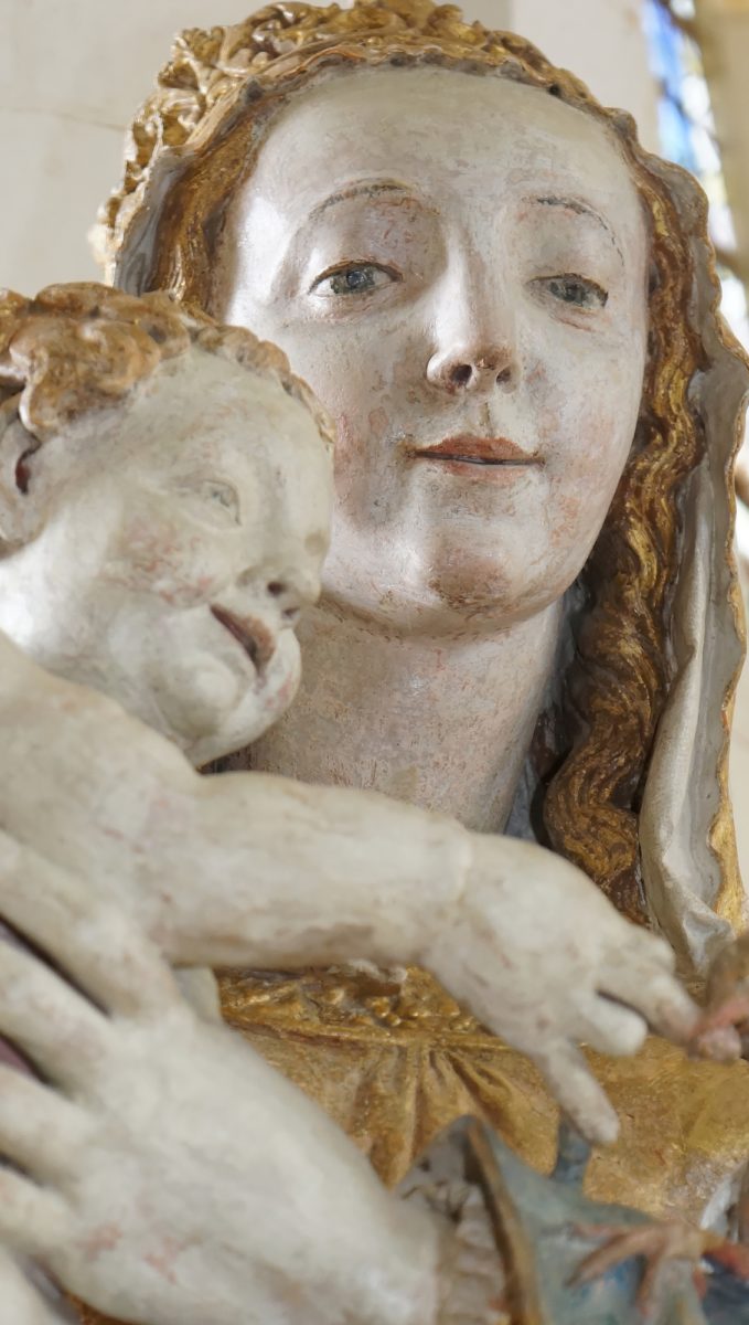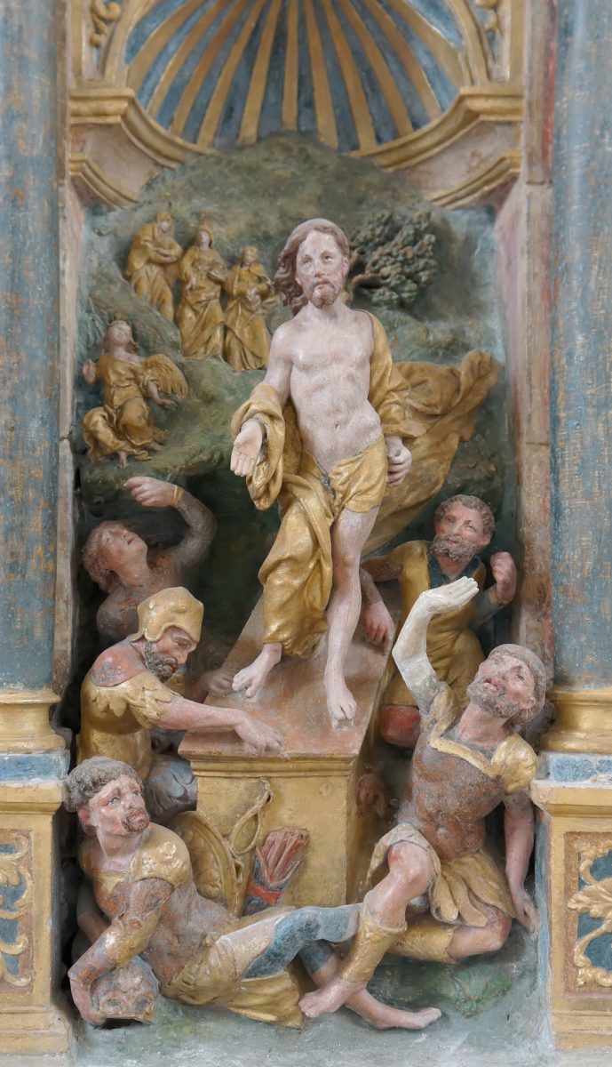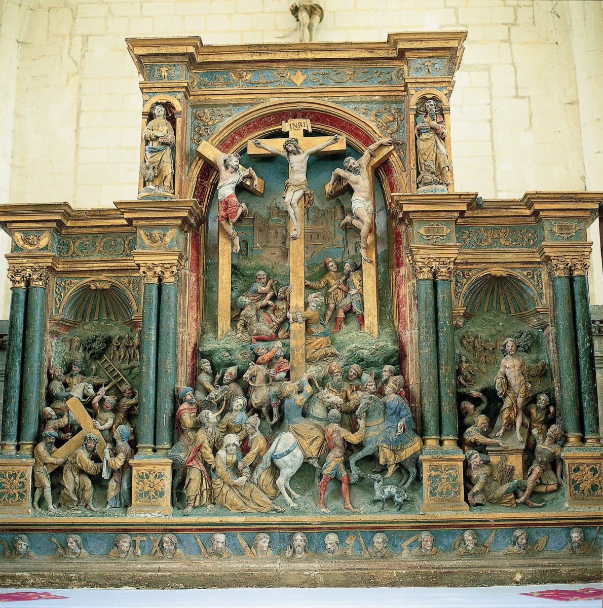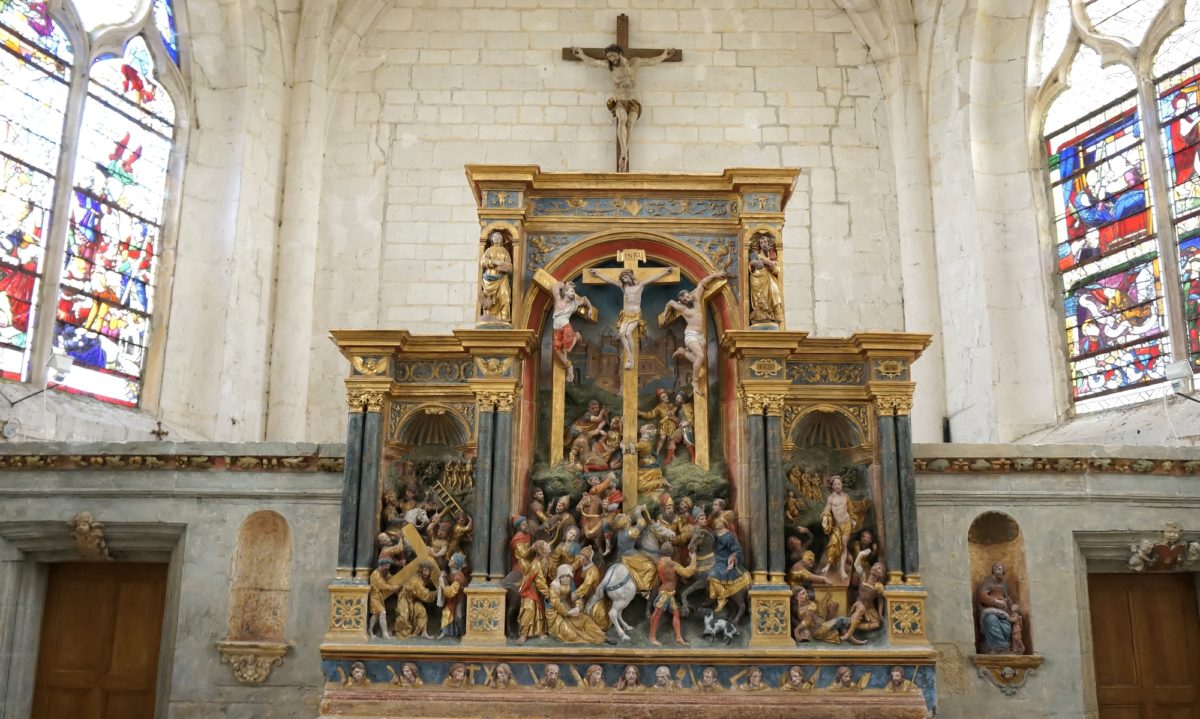 C’est à l’intérieur que l’église révèle sa qualité : le mobilier datant du XVIe siècle est tout simplement exceptionnel. Tout d’abord le retable typiquement Renaissance : ses sculptures polychromes illustrent la Passion du Christ et mettent en scène plus de 50 personnages. Composé de 3 panneaux séparés par des colonnes jumelées, ce retable est encadré en haut par un entablement à corniche dorée soutenu par des chapiteaux corinthiens et en bas par une prédelle présentant le portait de Jésus et de ses 12 apôtres. A gauche : le portement de croix. Au centre : la crucifixion est animée par une nuée de personnages en relief, l’impression de mouvement créée une vraie émotion. Et à droite, au cours de la résurrection, Jésus semble sortir du tableau dans un geste gracieux.