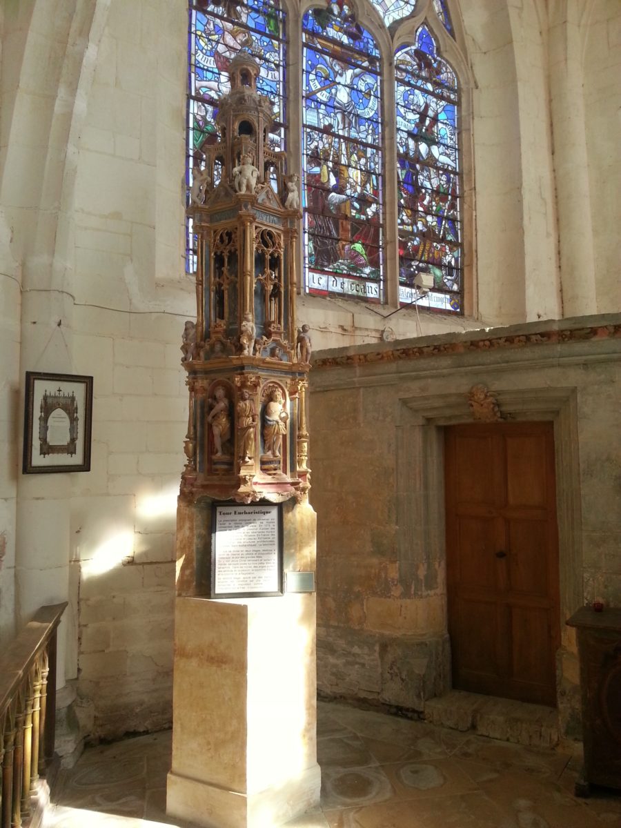 Ensuite, la tour eucharistique d’architecture gothique est exceptionnelle par sa taille : 3,75 m. Sculpté en pierre, ce meuble est très rare dans les églises : le ciboire qui abrite les hosties est généralement rangé dans un tabernacle placé sur l’autel. Enfin, l’église abrite aussi quelques statues du XVIe siècle dont un Saint Pierre et une Education à la Vierge avec Sainte Anne.